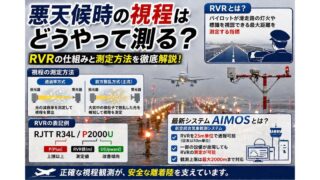 航空悪天候時の視程はどうやって測る?RVRの仕組みと測定方法をわかりやすく解説 梅雨もそろそろ本格化してきそうですね。大雨が降ったりすると空港の景色はあっという間に悪くなります。そんなときにパイロットは離着陸の時どのくらい遠くまで見えるかをMETARから認知するのですが、かなりの低視程の時には特殊な通報が行われてパイロットに知らせてくれます。今回はその設備について解説していきます。 2021.07.01航空