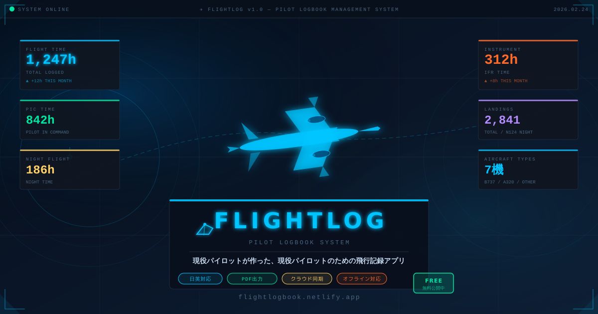 FlightLogは、パイロットの飛行記録(ログブック)をデジタルで管理するWebアプリです。ブラウザから無料でアクセスでき、スマートフォンでもPCでも使えます。