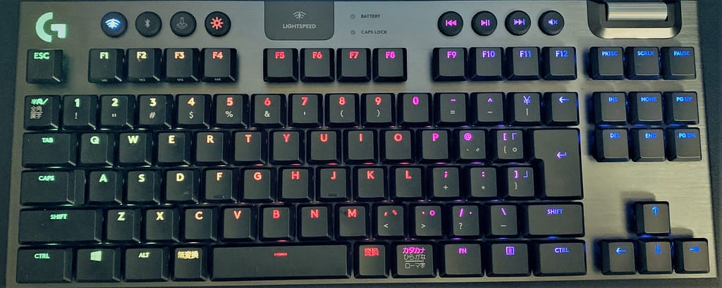 このキーボードの特徴として、テンキーレス(TKL)となっていてフルサイズキーボードだと右端にあるテンキーの部分がなくなっているので、机の使用面積が広がります。