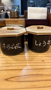 豚骨ラーメンには欠かせない、辛子高菜と生姜が置かれていて自由に投入できるのも地味に嬉しいです。