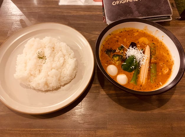 そしてコロ助は野菜を摂取するため、ココナッツスープのベジタブルカリーの5辛を注文。